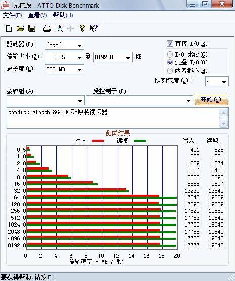 ATTO Disk Benchmark 是一款簡單易用的磁盤傳輸速率檢測軟件,可以用來檢測硬盤, U盤, 存儲卡及其它可移動磁盤的讀取及寫入速率。 該軟件使用了不同大小的數(shù)據(jù)測試包, 數(shù)據(jù)包按0.5K, 1.0K, 2.0K直到到8192.0KB進(jìn)行分別讀寫測試, 測試完成后數(shù)據(jù)用柱狀圖的形式表達(dá)出來。 很好的說明了文件大小比例不同對磁盤速度的影響