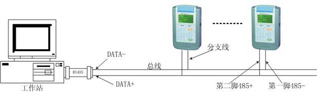 當使用多臺ID485通訊設備時,需要用485網絡聯網,總線使用5類以上屏蔽線中的一組雙絞線,按照485接線方法,將設備接入總線。注意:網絡中機具不能有重復編號,否則無法通訊。