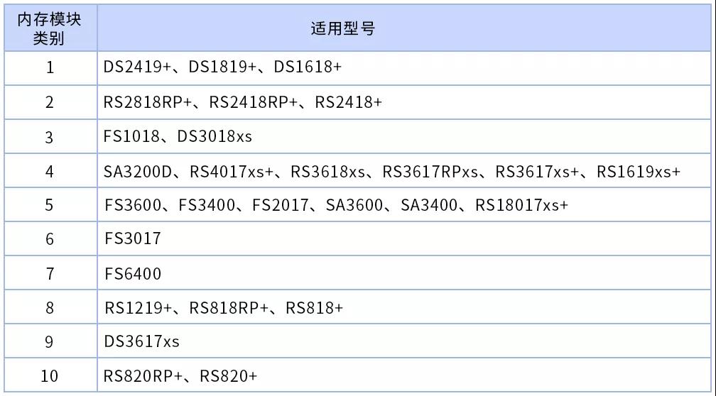 (RS820RP+/RS820+/DS3617xs無(wú)法移除預(yù)裝內(nèi)存)3)請(qǐng)使用群暉原裝內(nèi)存,以確保更好的兼容性和可靠性。如安裝非原裝內(nèi)存可能會(huì)導(dǎo)致系統(tǒng)不穩(wěn)定或啟動(dòng)失敗。并且將會(huì)影響產(chǎn)品售后技術(shù)支持服務(wù)等。4)以下NAS服務(wù)器型號(hào)擴(kuò)充內(nèi)存后,設(shè)備會(huì)在下次啟動(dòng)時(shí)執(zhí)行內(nèi)存檢查。過(guò)程可能需要10分鐘,具體時(shí)間取決于安裝的內(nèi)存大小。期間,電源LED指示燈會(huì)閃爍,且每次內(nèi)存配置改變后只會(huì)發(fā)生一次。內(nèi)存模塊類(lèi)別