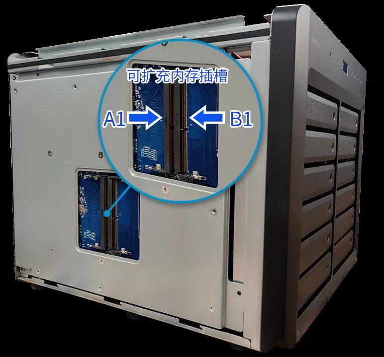 DS3617xs的預(yù)裝內(nèi)存模塊位于機(jī)箱內(nèi)部的插槽A0、B0,不可移除。您可以在機(jī)箱外部的可擴(kuò)充內(nèi)存插槽A1 、B1配置內(nèi)存。