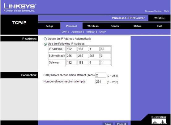 1-4: 點(diǎn)WIRELESS 配置無線, 出現(xiàn)下面界面,SSID 默認(rèn)是 為L(zhǎng)INKSYS , 如果是其他路由器。需要改為和路由 無線SSID 相同的名字,輸入時(shí)注意大小寫。錯(cuò)了不能連接上。其他不用管。記得點(diǎn)SAVE 保存。