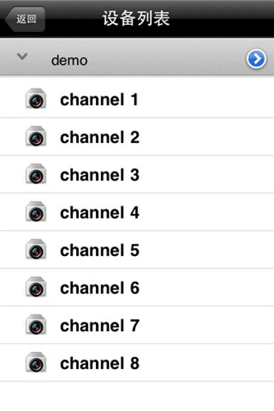 ,進入設備列表界面,展開設備通道,如下圖,然后點擊通道后,自動進入播放主界面,其他三畫面重復操作即可同時觀看四畫面。