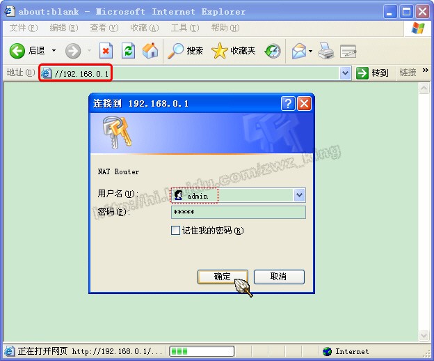 打開IE在地址欄輸入 //192.168.0.1 回車彈出對話框 輸入默認(rèn)用戶名和密碼 都是:admin(小寫)