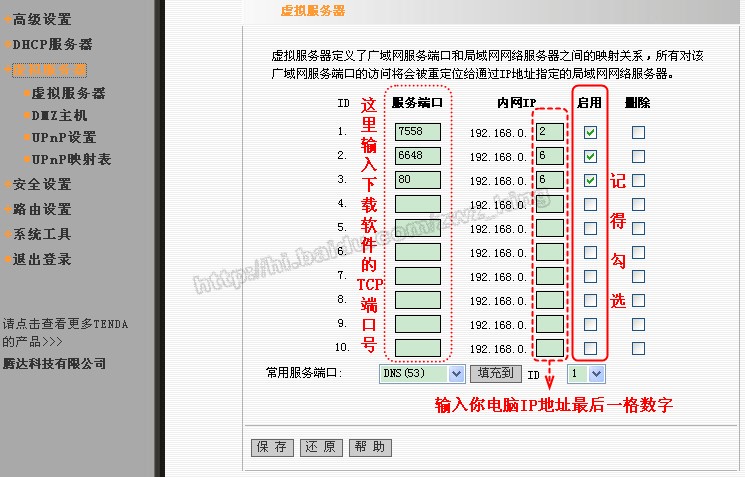 轉(zhuǎn)到虛擬服務(wù)器 輸入你的端口號 偶那個(gè) 7558 你的IP號 勾上啟用 最后保存