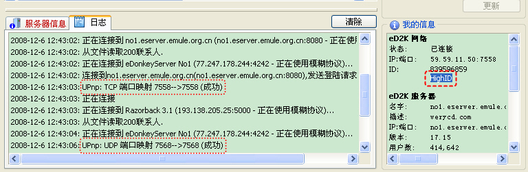 重啟 EMULE 進(jìn)去之后看到的就是大家一直想要的HighID了