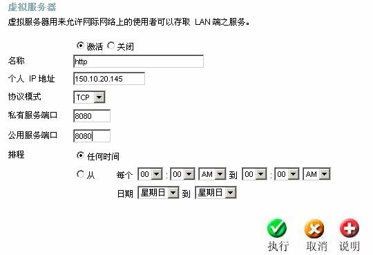 用戶選擇“進(jìn)階設(shè)定->虛擬服務(wù)器”,添加虛擬服務(wù)器
