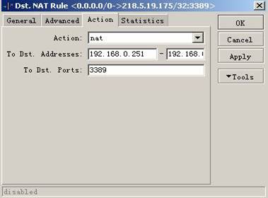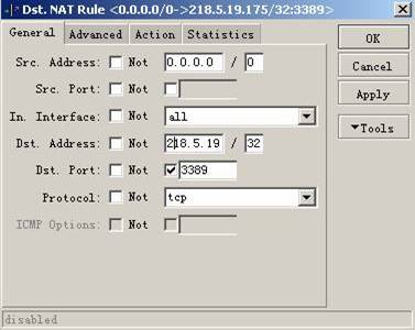 10端口映射在IP---firewall---destinationNAT general 的 dst address 輸外網(wǎng)IP 掩碼32 端口 協(xié)議 。